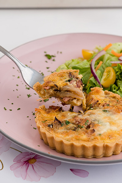 Tarta salada con base de huevo, crema dulce, pizca de nuez moscada, cebolla caramelizada, tomate cherry, hongos, espinaca y queso gratinado