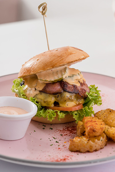 New York steak, lechuga, tomate, pepinillos, blue cheese, tocino, cebolla empanizada y aderezo honey mostard
